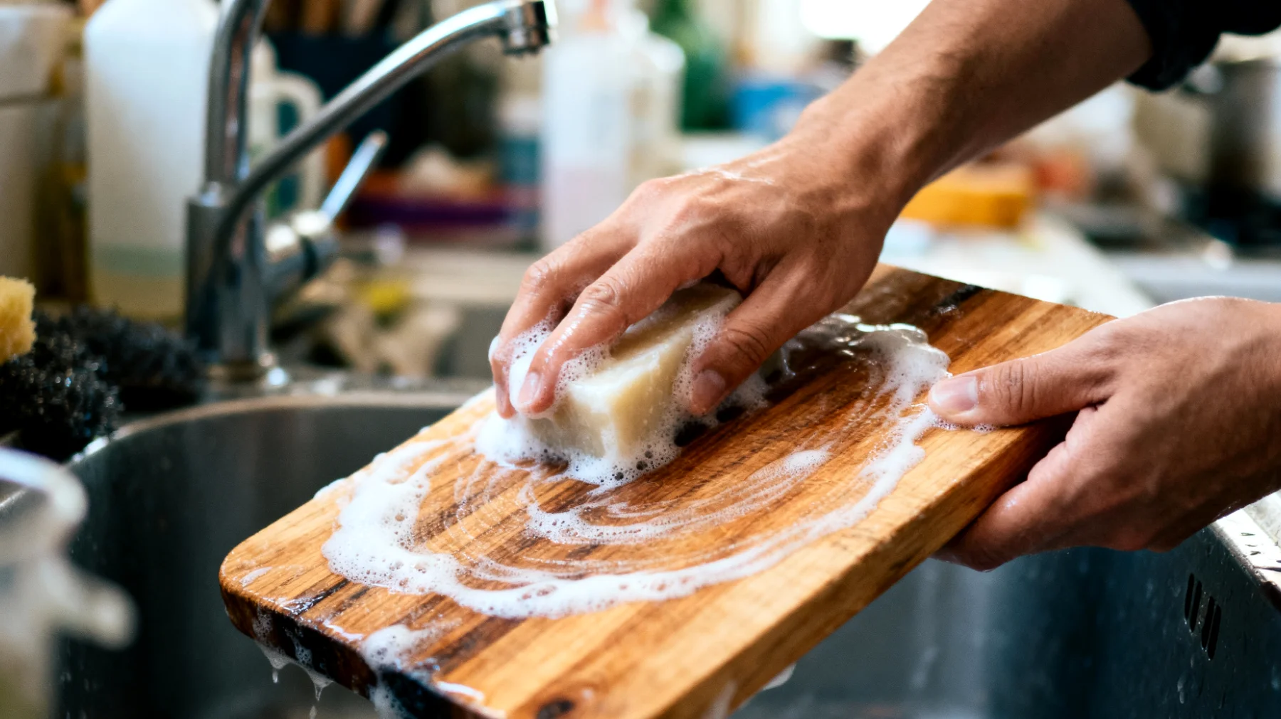 Nel caso di aglio, cipolla o pesce crudo, il legno non solo trattiene molecole odorose ma può anche ospitare residui di grasso e proteine che si depositano durante il taglio. Queste sostanze si legano chimicamente al legno in modo diverso rispetto a materiali impermeabili come il vetro. I detergenti comuni per stoviglie sono progettati per rimuovere grassi e residui dalle superfici lisce e non porose, manca loro una componente fondamentale: agenti capaci di ossidare le molecole organiche complesse responsabili dell’odore persistente. Ecco perché lavare energicamente il tagliere sotto l’acqua calda spesso non basta.